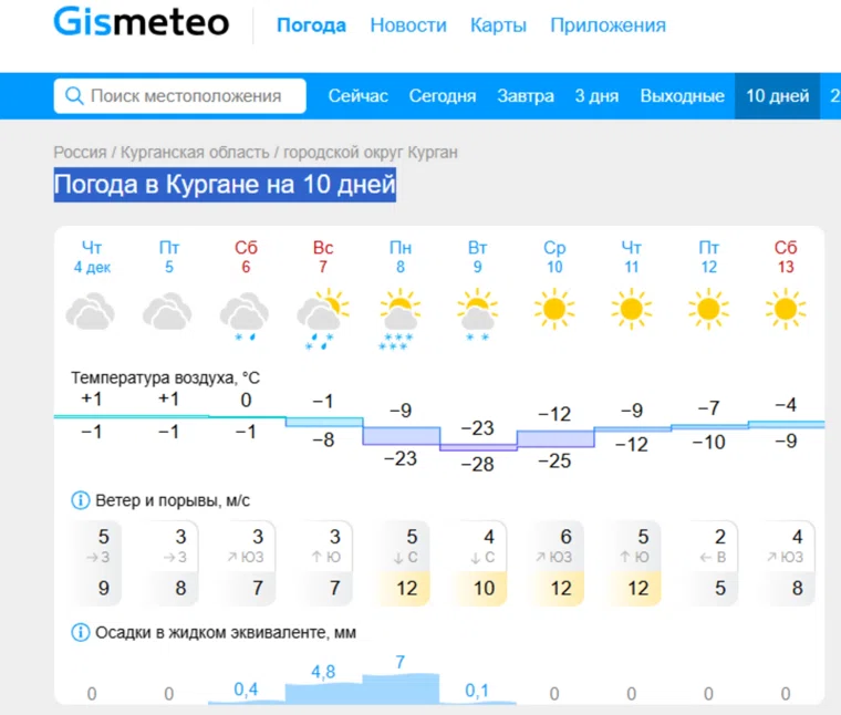 Ранее синоптики сообщали, что первая декада декабря в Курганской области будет аномально теплой и преимущественно без осадков, с плюсовой температурой и кратковременным снегом с дождем 8–9 декабря. С 10 по 12 декабря прогнозировался устойчивый минус и снег, а во второй половине месяца — относительно мягкие морозы до минус 9 градусов и продолжительные снегопады.
