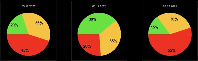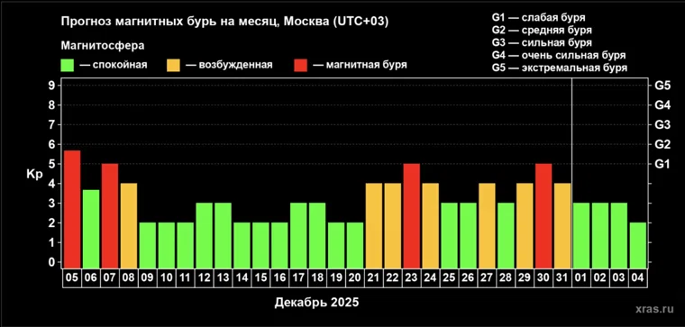 - 5–7 декабря — период повышенной вероятности возмущений, возможны слабые магнитные бури.