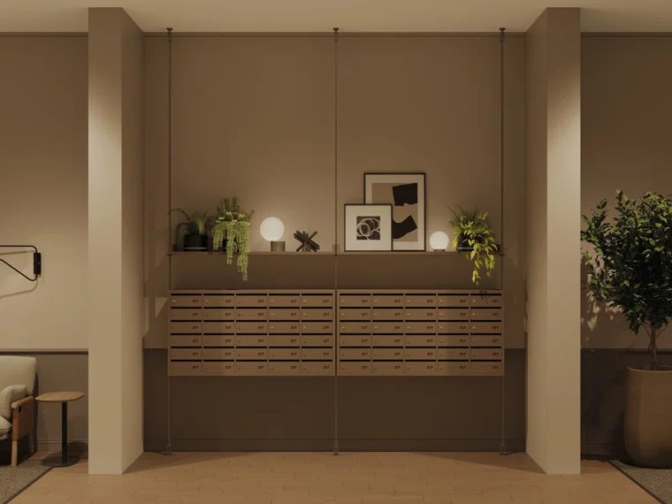 Первые этажи домов в жилом комплексе спроектированы как гостиные. Здесь стоят кресла, диваны, растения, на стенах — картины и зеркала. В такой обстановке удобно подождать такси, встретить курьера, поговорить с соседом, почитать или поработать.