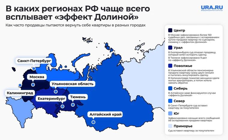 В обиходе россиян появилось выражение «эффект Долиной». Так стали обозначать ситуацию, при которой продавец недвижимости, через суд признает сделку купли-продажи недействительной и возвращает ее себе. При этом средства добросовестным покупателям не возвращаются. В Москве, по данным специалистов, зарегистрировано около 150 судебных разбирательств, связанных с оспариванием договоров купли-продажи недвижимости. В каких российских регионах всплывает «эффект Долиной» — в материале URA.RU.