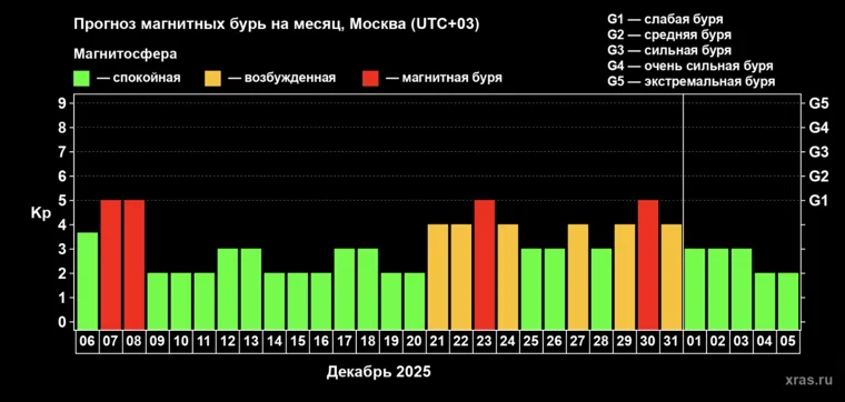 - 21–24 декабря — еще один пик активности: прогнозируется новая серия бурь уровня G1.