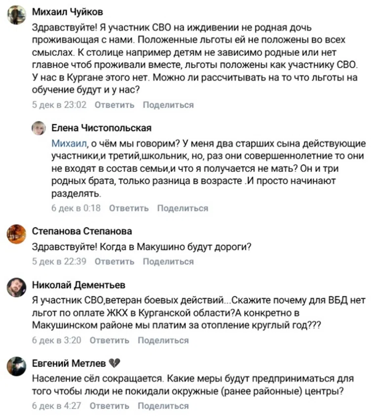«Какие льготы существуют в регионе для участников СВО по оплате услуг ЖКХ? Когда в Макушино сделают дороги? Какие меры будут предприниматься, чтобы люди не покидали райцентры?», — сообщается в вопросах, которые жители задали в комментариях на странице ЦУР региона в соцсети «ВКонтакте».