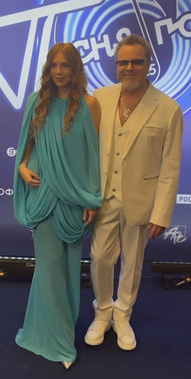 Наталью Подольскую и Владимира Преснякова назвали одной из самых стильных пар. Для «Песни года» Наталья выбрала платье небесного цвета с оголенной спиной. А Владимир появился в белоснежном костюме-тройке на голое тело.