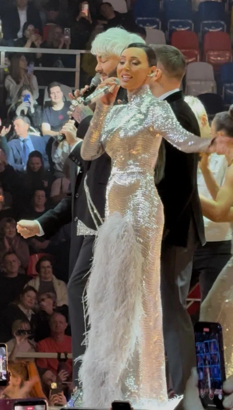 Нюша приехала в концертный зал прямо в бигудях, которые сняла уже в гримерке. На сцене она появилась в дерзком красном мини-платье, оголив ноги, руки и зону декольте. Из-за наряда с ней тоже случился конфуз. Оказалось, Нюше в нем было не совсем комфортно. «Артистка замерзла», — заявила ее помощница и, укутав Нюшу в пуховик, отвела в гримерку.