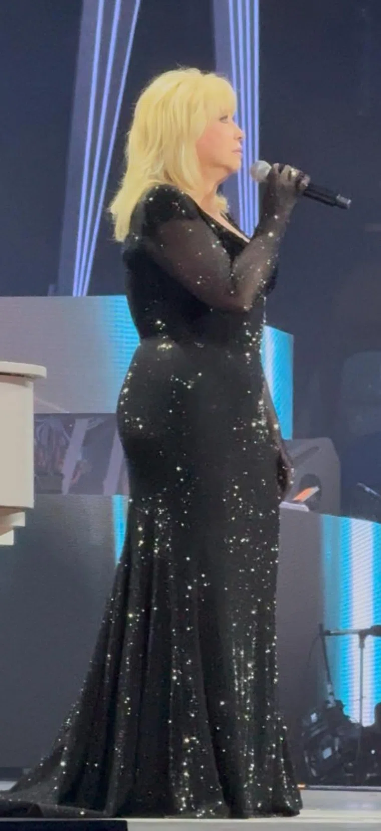 «Мы это платье сшили специально для „Песни года“, — рассказала певица. — Мне очень нравится. Перья страуса красиво развиваются на ветру».