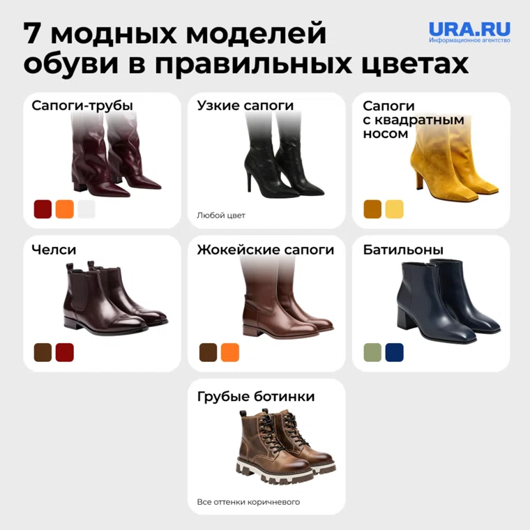 «Рыжий, бордовый, коричневый — это прям абсолютный тренд, — говорит стилист. — Если вам понравилась модель горчичного цвета — почему бы нет? Можно носить горчичные с темно-синим платьем, с темно-зеленым — это тоже будет красиво».