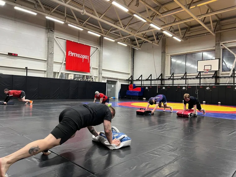 Разминка длится 20 минут, затем начинается основная часть. Чтобы понять, что регби — это спорт не для слабаков, мне хватило 10 минут. Много времени ушло на то, чтобы научиться быстро вставать из положений сидя и лежа и сразу бежать. В регби этот навык ключевой. Затем началась работа на мышцы кора в статическо-динамических упражнениях. Мы тянули щит-макивару по татами, в промежутки работали на контакт — с положения лежа ударяли щит плечом для набивки мышц, захватывали щит в положении лежа. И так 30-40 минут, после которых уже чувствуешь себя вымотанным и побитым. Но это еще не все.