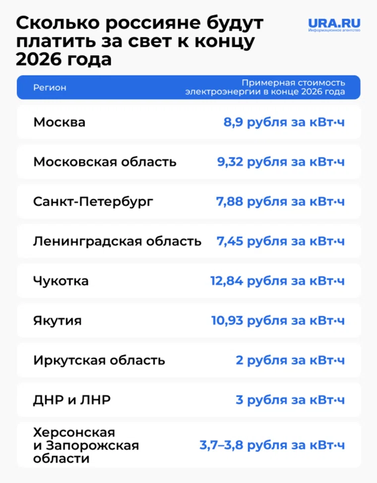 Тарифы на свет в 2026 году: как будут расти цены на электроэнергию в регионах России. Инфографика