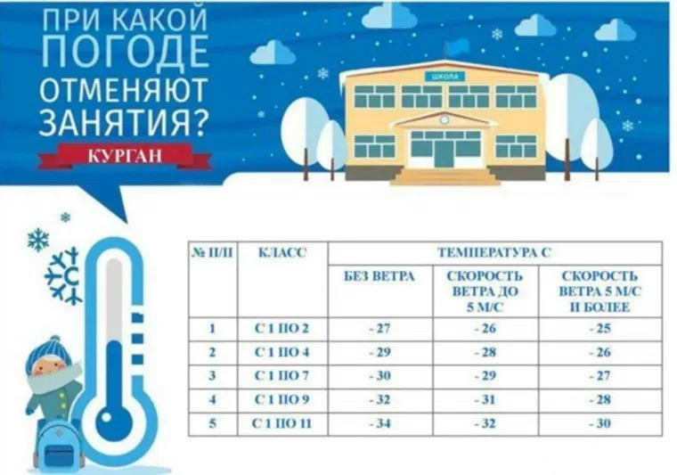 Для школ Кургана разработана и действует специальная температурная шкала наружного воздуха. В документе закреплены пороговые значения, при достижении которых занятия для отдельных параллелей или всех классов могут быть отменены. «Отмены с 1 по 2 класс при температуре -27...-25 (зависит от ветра). Отмены с 1 по 9 класс при температуре -32...-28. И отмены с 1 по 11 класс при температуре -34...-30», — написано на сайте мэрии.