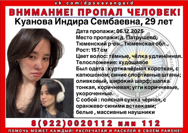 «В деревне Патрушева 6 декабря пропала Куанова Индира Сембаевна, 29 лет. Приметы: рост 157 сантиметров, темные волосы, носит удлиненную челку, худощавая. Был одета в короткую черную куртку с капюшоном, синие спортивные штаны, широкий оливковый шарф, коричневую шапку, коричневые угги», — говорится в ориентировке.