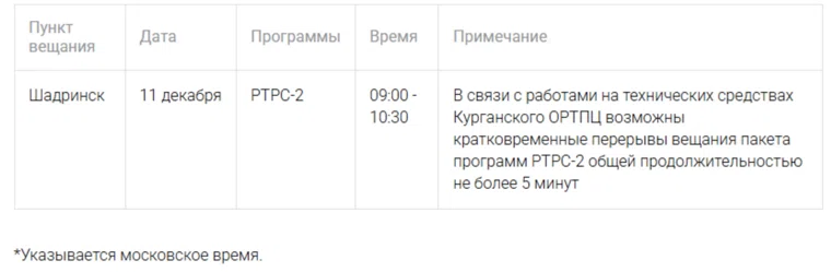 «В Шадринске 11 декабря с 11:00-12:30 (по местному времени — прим.ред.) возможны кратковременные перерывы вещания пакета программ РТРС-2 общей продолжительностью не более пяти минут. В это время на станциях будут проходить профилактические или другие плановые работы», — написано на сайте.