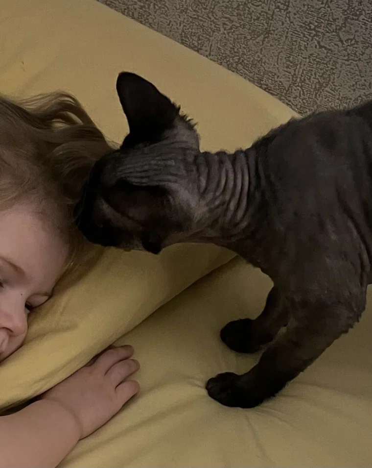 Первое время Аста боялась дочку, обе были еще слишком маленькими. Сейчас они подросли, вместе играют. Говорят, якобы сфинксы злые. Как родитель, я боялась агрессии в сторону ребенка. Но наша кошка оказалась тактильной и ласковой, спит с нами в одной кровати и приходит обниматься.