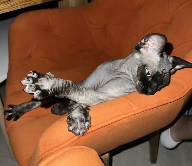 Заводчица сразу предупредила: «Немного пушок есть». Но со временем пушок превратился в целый велюр. Так что наш сфинкс — не совсем лысый, главное Аста была приучена к лотку.